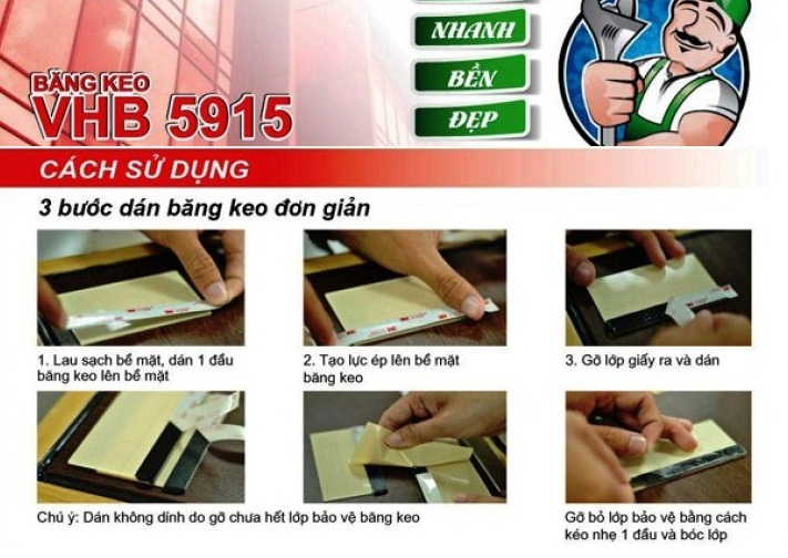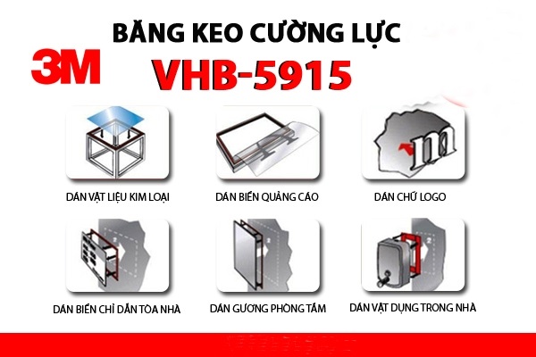 Ngoài ra, Băng keo cường lực siêu mỏng 3M khổ 12mm x 33m VHB 5915-12 còn ứng dụng trong đồ dùng gia đình như dùng dán các vật dụng trang trí mang tính thẩm mỹ cao...; dán cố định khung tranh lên bàn gỗ, tường gỗ; dán biển số nhà hay các ký tự cho biển quảng cáo...