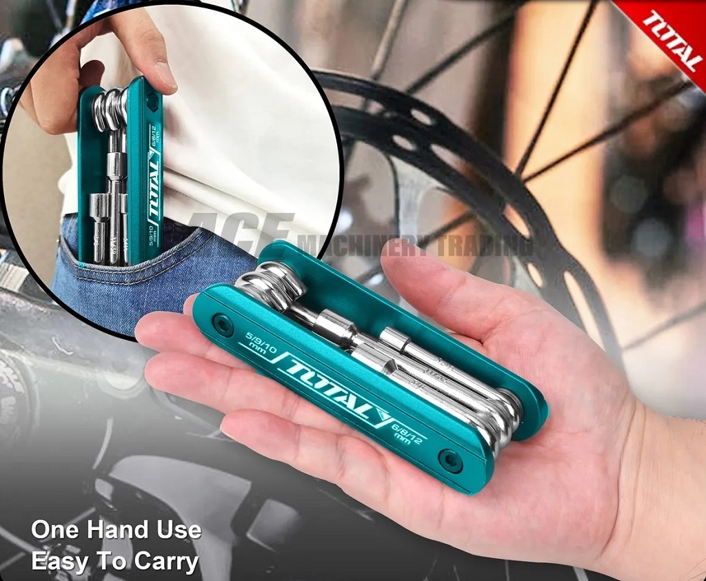 Đa dạng kích thước: Bộ chìa lục giác TOTAL THFND061 bao gồm các chìa lục giác với kích thước từ 5mm đến 12mm. Điều này cho phép bạn lựa chọn chìa lục giác phù hợp với kích cỡ của ốc vít cần tháo lắp.