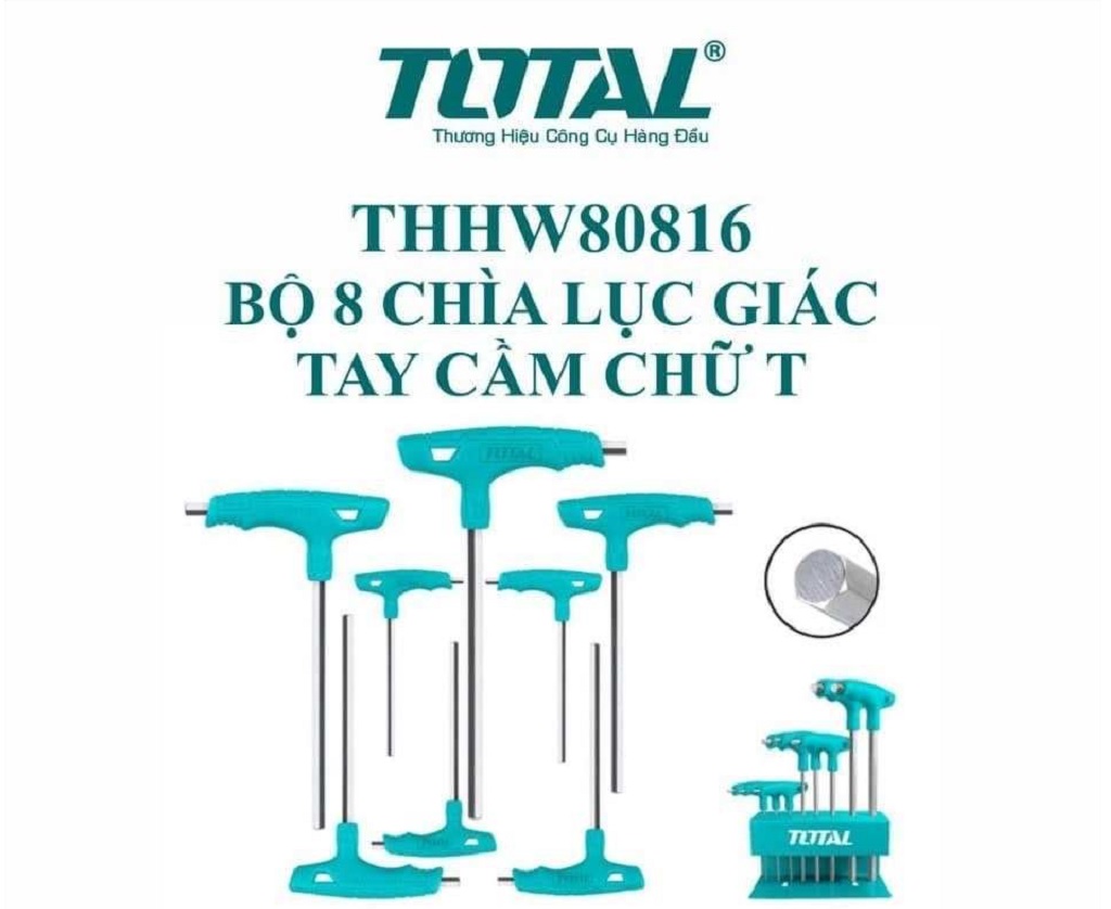 Bộ 8 chìa lục giác có tay cầm chữ T chắc chắn TOTAL THHW80816 là một bộ dụng cụ cơ khí chuyên dụng linh hoạt, dùng để tháo các loại ốc vít nhiều kích thước khác nhau, được làm từ vật liệu thép chuyên dụng CR-V cứng cáp và bền bỉ.