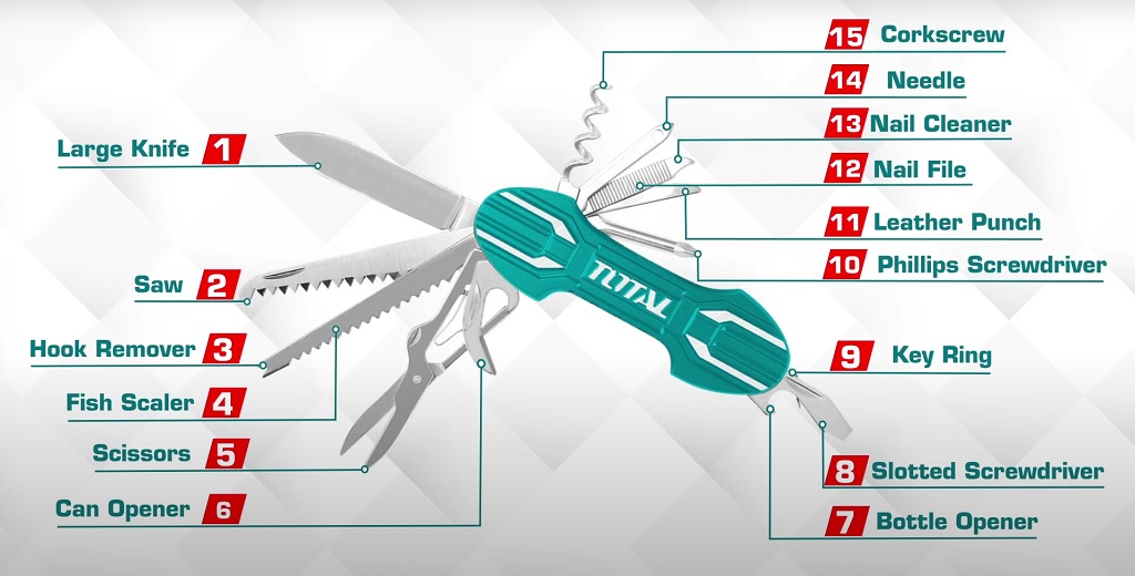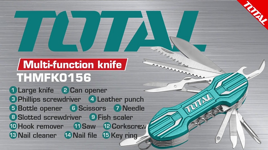 Bộ dao cắt đa năng 15 công dụng TOTAL THMFK0156 là một sản phẩm đa năng và tiện lợi, tích hợp sẵn các loại mũi bắt vít, dao, kéo, cưa, mở nắp chai,... trong 1 tay cầm nhỏ gọn và tiện lợi.