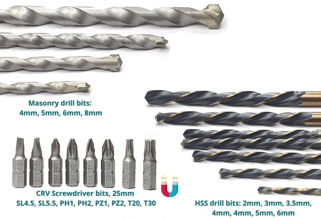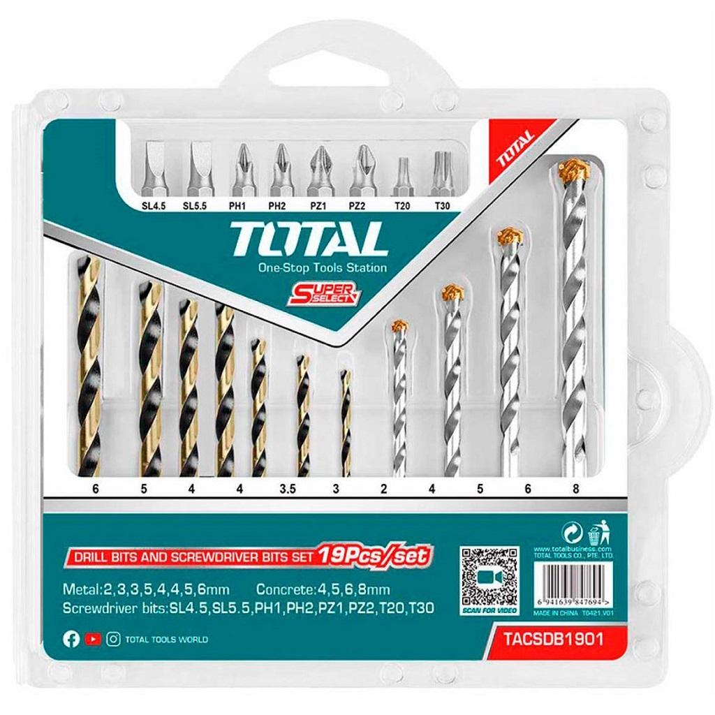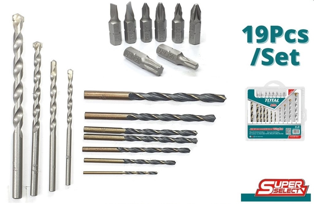 Bộ mũi khoan kim loại, khoan bê tông và bắt vít 19 chi tiết TOTAL TACSDB1901 gồm có 7 mũi khoan kim loại, 4 mũi khoan bê tông và 8 mũi siết vít giúp bạn có thể khoan hoặc bắt vít một cách dễ dàng chỉ với 1 bộ mũi nhỏ gọn