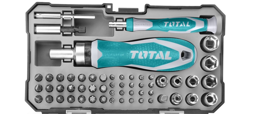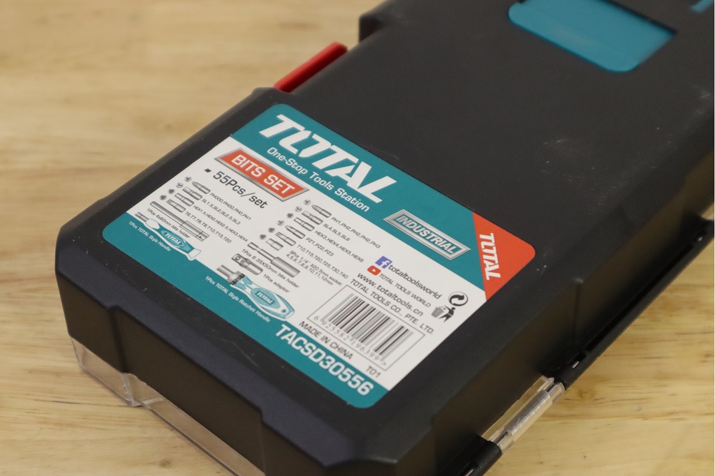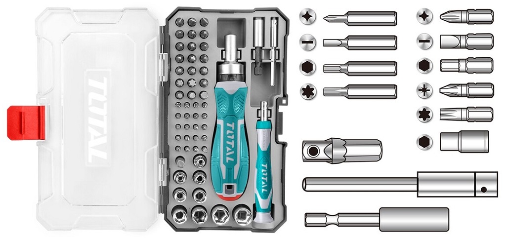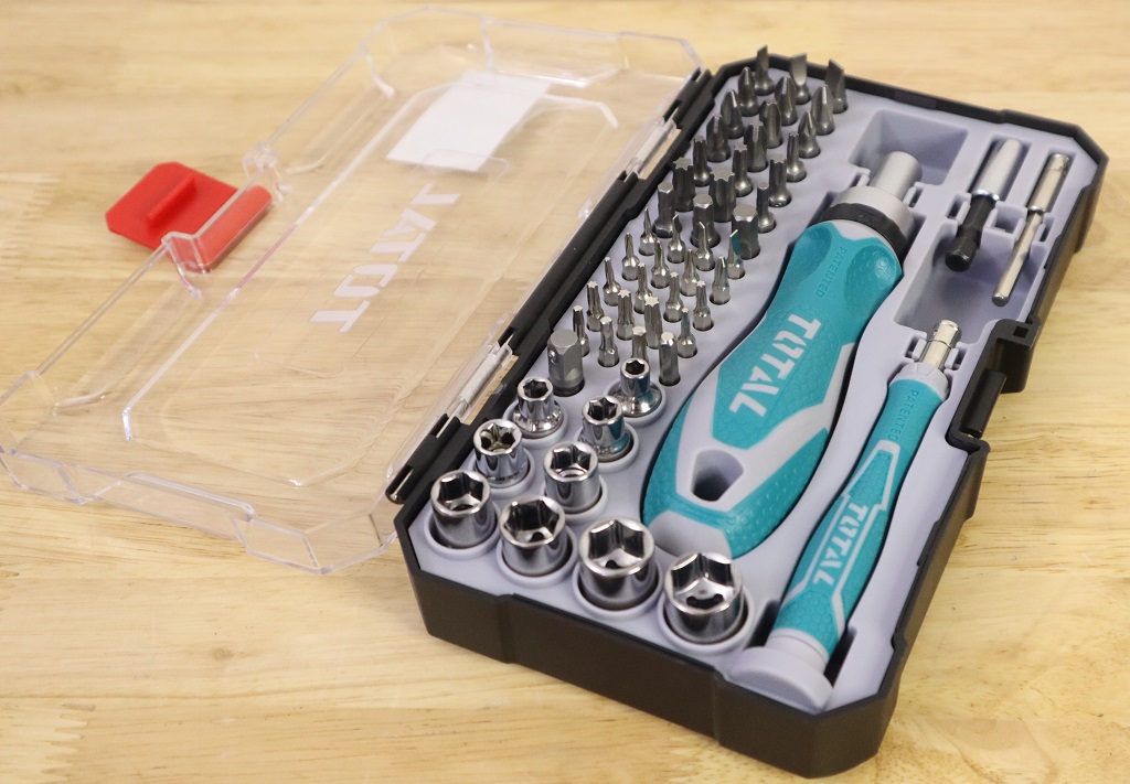 Bộ tua vít 2 thanh vặn tay 55 chi tiết đa năng TOTAL TACSD30556 có 41 mũi vít, 1 khớp nối, 9 đầu cắm, 1 đầu giữ nhỏ, 1 đầu giữ lớn, 2 tay cầm và 1 hộp nhựa bảo quản