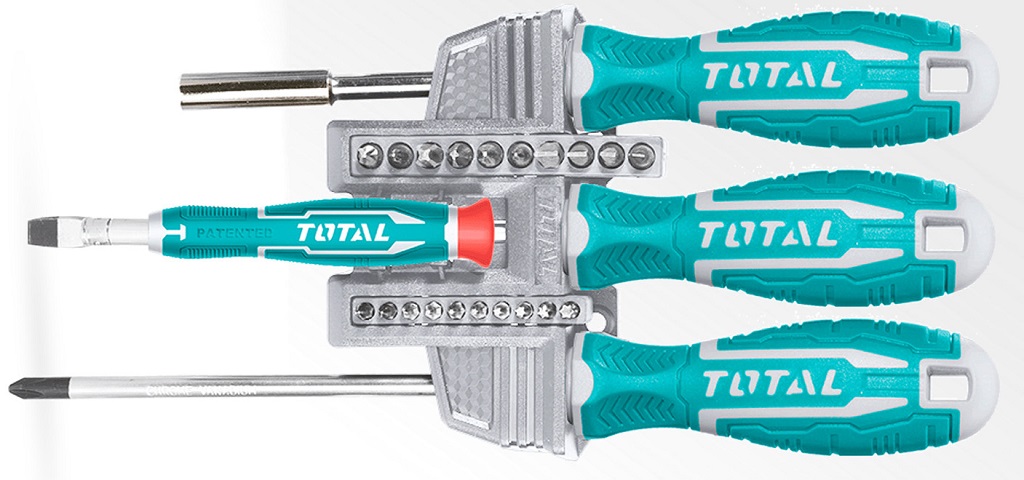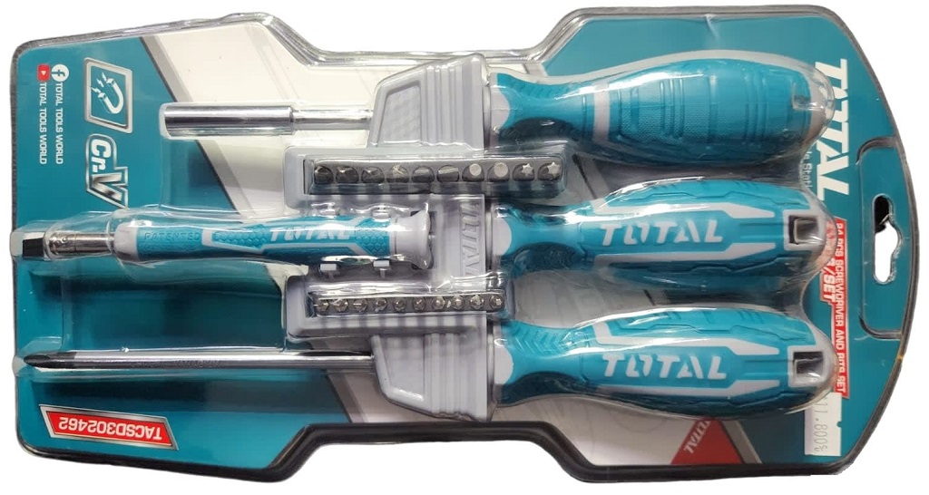 Bộ tua vít 24 chi tiết đa năng TOTAL TACSD302462 có 24 chi tiết gồm 3 tua vít và 21 chi tiết đầu vít được hoàn thiện chất lượng cao, tay cầm chắc chắn khi sử dụng.