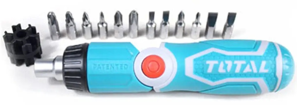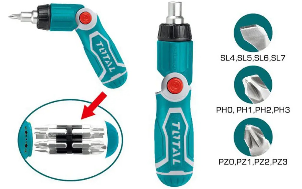 Bộ tua vít gấp đa năng 13 chi tiết TOTAL TACSD30136 có thiết kế tay cầm xoay để có thể sử dụng ở các vị trí góc hẹp, nhỏ mà các thiết bị khác không thể làm được