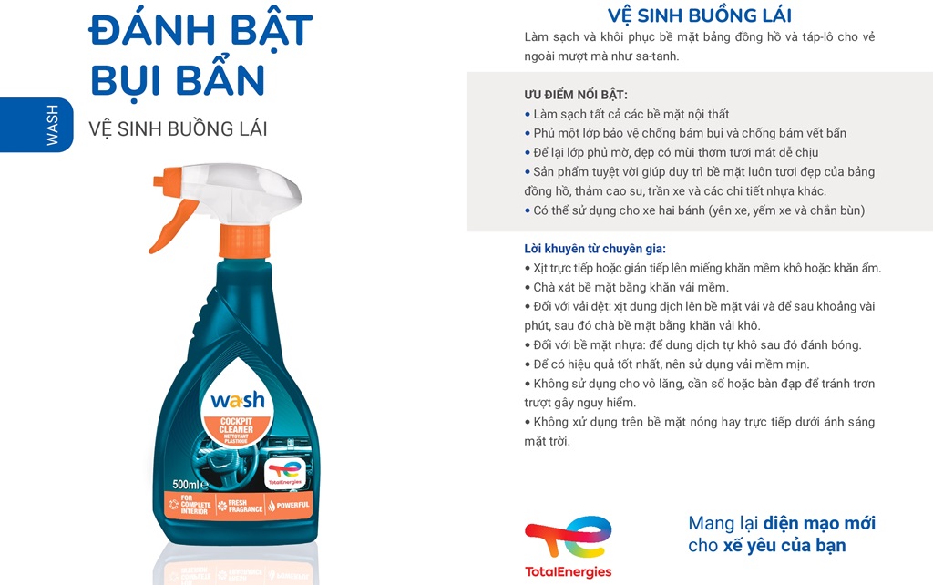 - Tên sản phẩm: Chai xịt làm sạch và bảo dưỡng nhựa buồng lái nội thất xe Total Energies TE-CC500 500ml