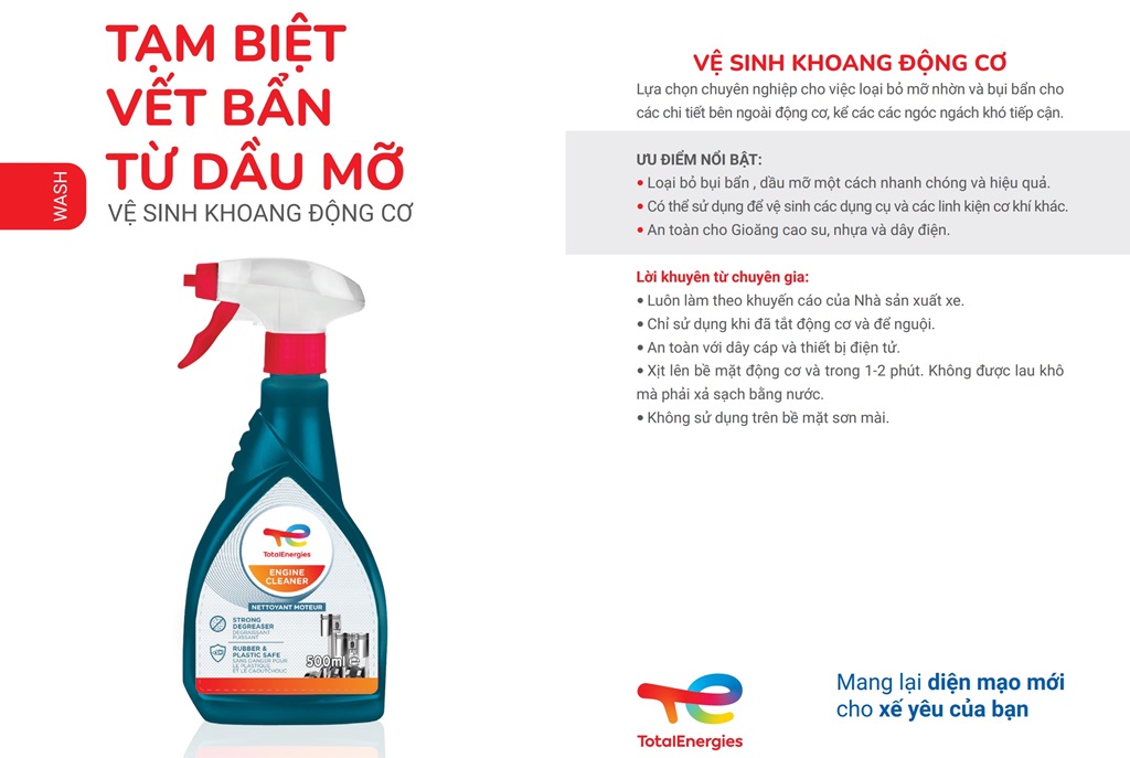 Chai xịt vệ sinh khoang động cơ, lốc máy xe ô tô Total Energies TE-EC500 có tác dụng rửa sạch phía bên ngoài của động cơ xe (phần phía trước của động cơ). Sản phẩm được phát triển để rửa sạch dễ dàng các vết bẩn do bụi và dầu nhớt. Công thức đậm đặc được thiết kế để dùng cho kim loại, cao su và nhựa nhưng lại không gây hại gì cho hệ thống dây điện.