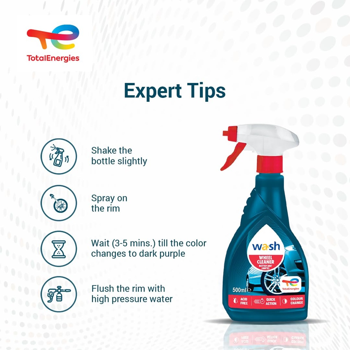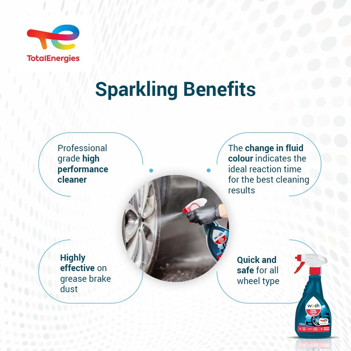 Chai xịt vệ sinh vành xe, mâm xe, hợp kim và vành thép má phanh Total Energies TE-WC500 500ml không chứa Acid nên không hay hư hỏng hay mòn vị trí sử dụng