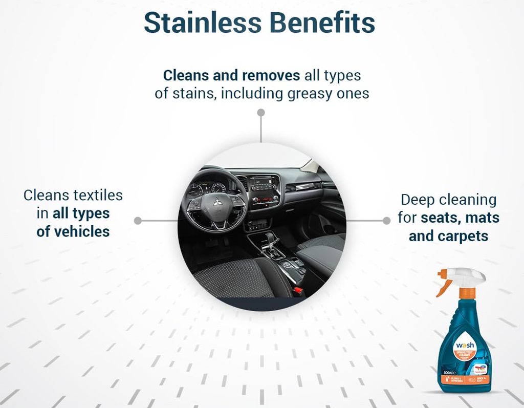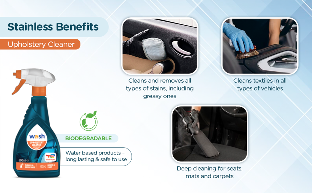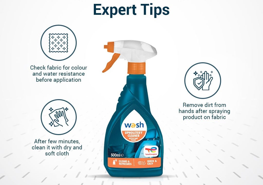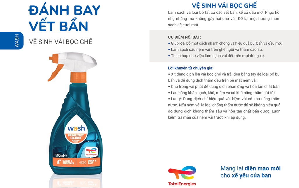 Dung dịch vệ sinh ghế, thảm, vải xe ô tô Total Energies TE-UC500 500ml Là loại hợp chất chuyên dụng để làm sạch nhanh và khử mùi hôi trên vải, thảm, nỉ, pa-nen, trần nóc xe, nệm, alcantara và nội thất gia đình hổ trợ phục hồi vải như mới, loại bỏ các vết bẩn cứng đầu như Socola, kem, coca, cafe, dầu mỡ, nước cà chua,...