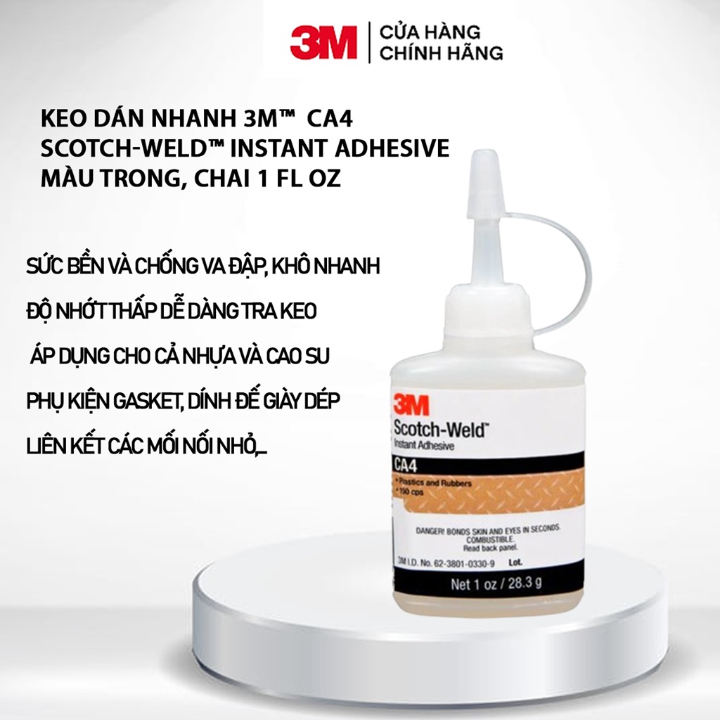 Keo dán nhanh trong suốt siêu dính Scotch-Weld 28.3g 3M Scotch-Weld CA4 thường dùng dán đồ thể thao (giày, dép), dụng cụ thể thao và vật dụng gia đình.