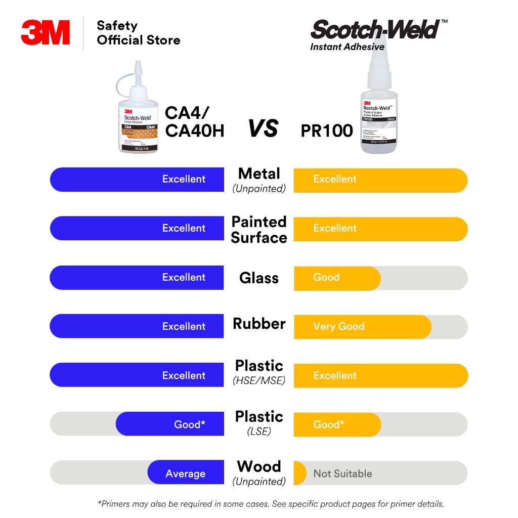 Keo dán nhanh trong suốt siêu dính Scotch-Weld 28.3g 3M Scotch-Weld CA4 có thể sử dụng được cho các bề mặt khó dính như Nhựa (Ni-lông), Cao su (không bao gồm EPDM), Nhựa (ABB, PVC, Acrylic), Cao su dạng bọt (Latex, urethane), Vải, nỉ, vỏ cây bần, hoặc sợi thủy tinh, Nhựa (Vinyl linh hoạt), Nhựa (Polyolefins và Thermoplastic Elastomers), Gỗ, Giấy và bề mặt giấy carton, Mịn, Cao su EPDM, Năng lượng bề mặt cao (400-1100 Dynes/cm), Cao su dạng bọt cứng (urethane), Kim loại, Cao su dạng bọt cứng (dạng styrene), Da, Thủy tinh và gốm, sứ, bề mặt đá tráng ceramics,...