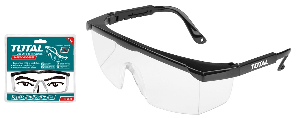 Kính bảo hộ lao động chống bụi và chống tia UV TOTAL TSP301 là sản phẩm chuyên dụng để bảo vệ mắt khi mài hoặc chà nhám gỗ, kim loại, đá, làm vườn