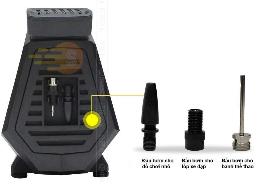 Ngoài ra, máy còn có kèm theo nhiều loại van bơm khác nhau: van bơm bóng, bơm xe máy, xe đạp, xuồng, phao…