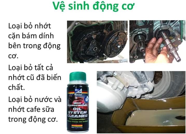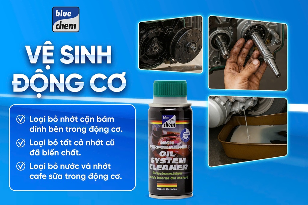 Phụ gia nhớt vệ sinh động cơ xe máy Bluechem 33017 giúp loại bỏ nhớt cũ, cặn bã lâu ngày bám dính trong động cơ hổ trợ động cơ tăng hiệu quả hoạt động cũng như khả năng kéo dài tuổi thọ cho động cơ.