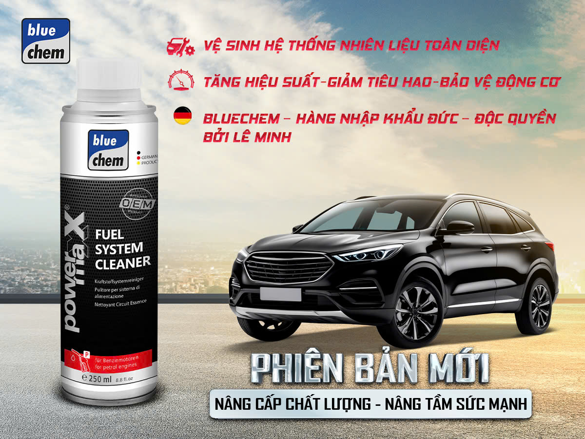 Phụ gia xăng cho ô tô Bluechem 33028E giúp làm sạch cặn bẩn trong bình và ống dẫn xăng, kim phun xăng, muội than và tạp chất trong buồng đốt. giúp phục hồi động cơ, tiết kiệm nhiên liệu và tăng tốc dễ dàng.