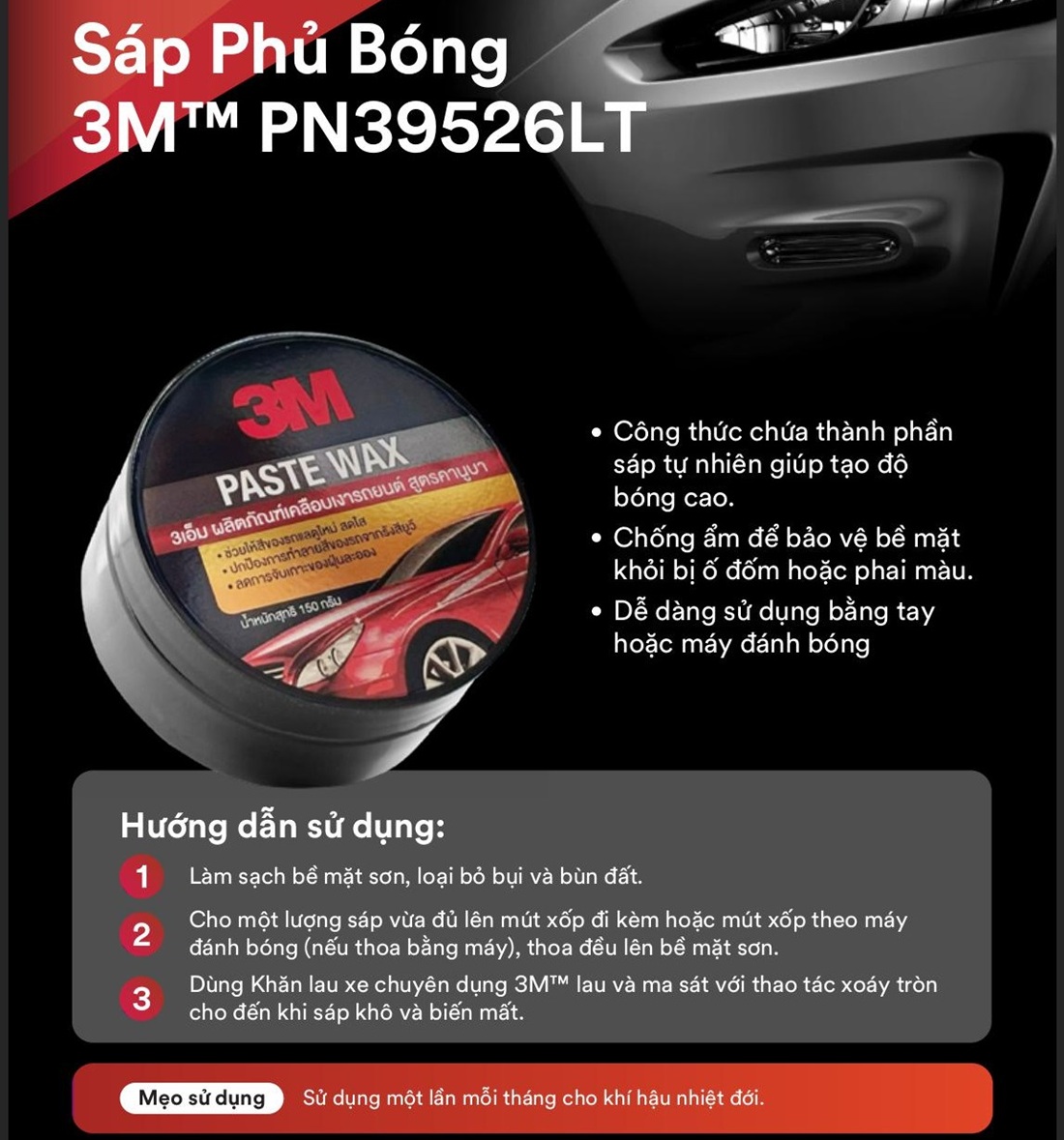 Sáp đánh bóng sơn xe ô tô cao cấp (Paste Wax) 3M 150g PN39526LT là sản phẩm sáp đánh bóng xe sử dụng công nghệ mới hiện đại. Nó được đặc biệt chế tạo cho việc chăm sóc và bảo dưỡng cho bộ phận của xe được làm từ cờ rôm, sợi thủy tinh. Sản phẩm lưu lại 1 lớp bảo vệ sơn xe khỏi tác động của thời tiết giúp xe luôn đẹp và an toàn hơn.
