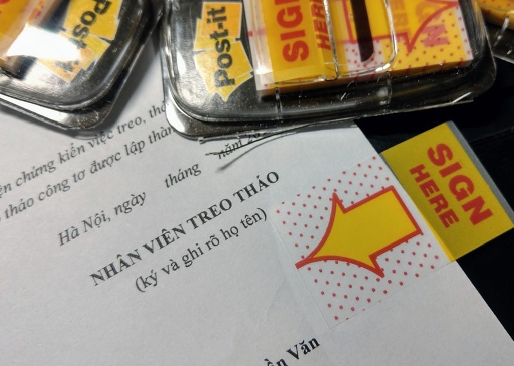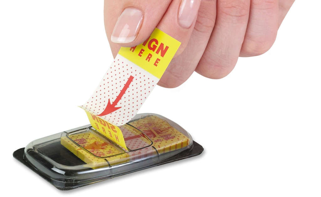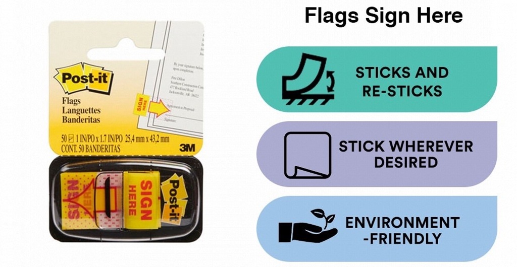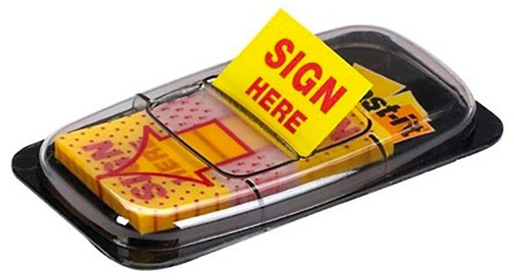 Vỉ 50 miếng noted đánh dấu trình ký Post It Sign Here 3M SB-680-9 với 50 miếng đánh dấu ghi chú vị trí phân trang sách, vở, tài liệu cũng như ghi chú vị trí ký tên tránh bị sai sót trong quá trình ký kết hợp đồng, tài liệu.