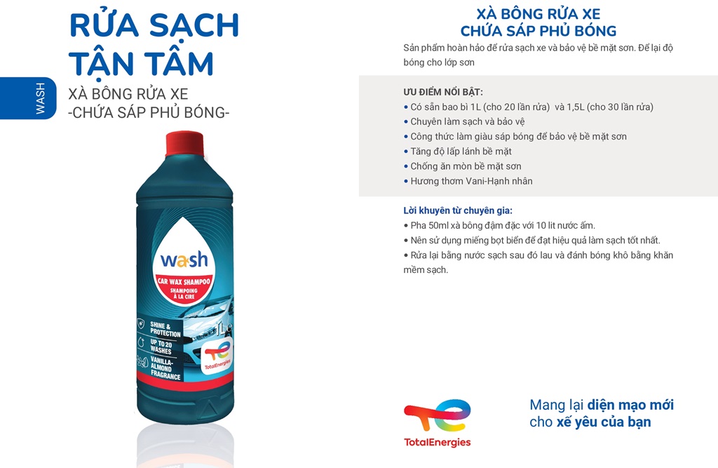 Bạn có biết chỉ cần sử dụng Xà bông rửa xe có chứa sáp phủ bóng sơn xe 2in1 Total Energies TE-CW1L là bạn đã có thể tẩy rửa tất cả bụi bẩn bùn đất bám trên xế yêu một cách an toàn và tiết kiệm.
